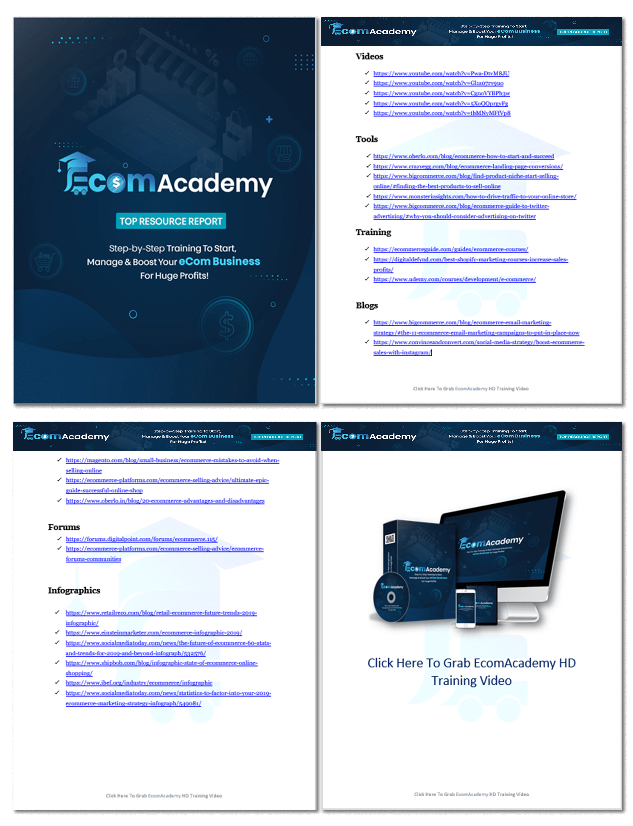 This is a comprehensive Research Report on eCommerce. It includes Videos, Tools, Training courses, Forums, Affiliate programs, Infographics, Facts, and Case studies.